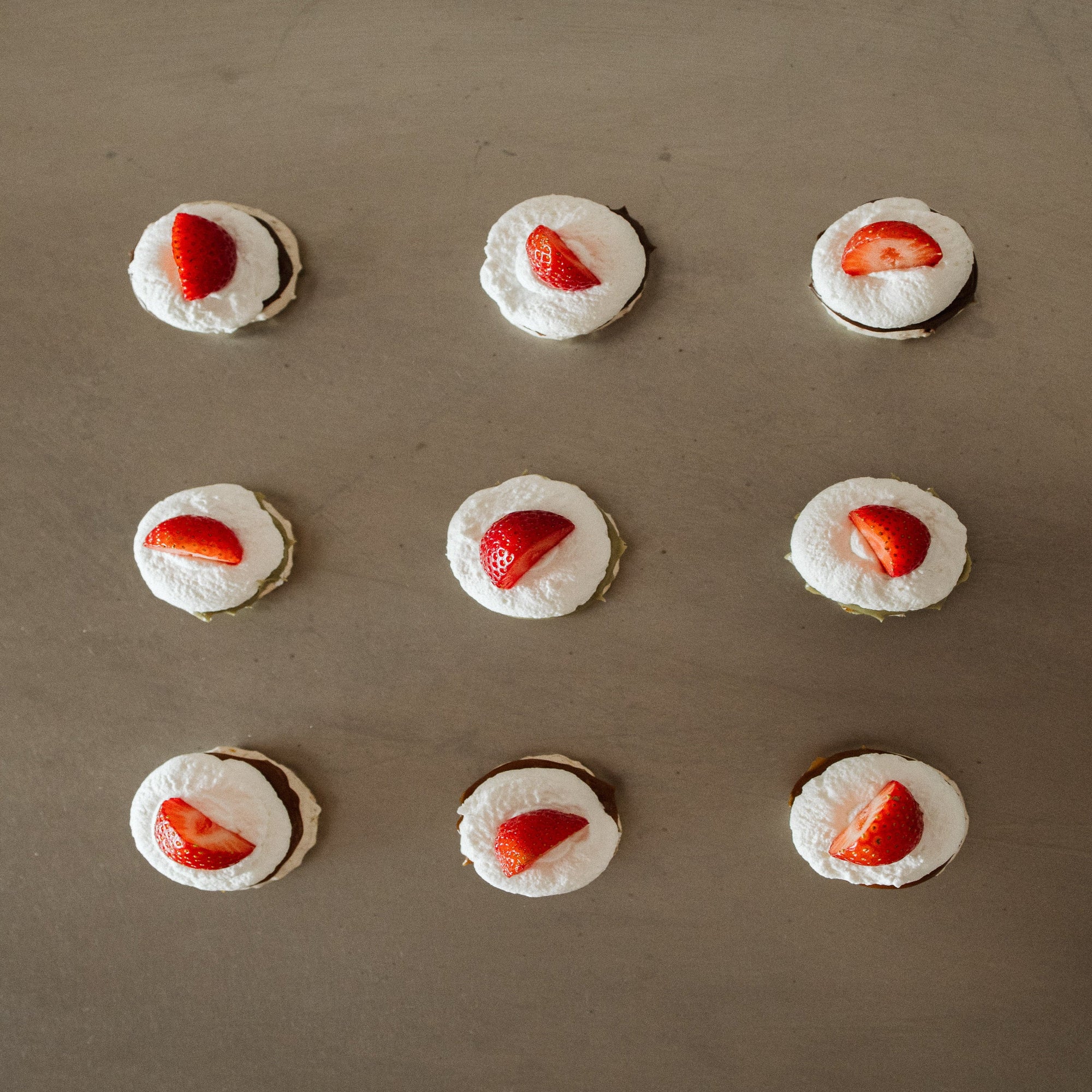 - Y una capa final de nata fresca y fruta de temporada, que evoluciona con el año: fresas en primavera, higos en otoño, frutos rojos en invierno.